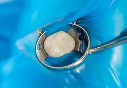 感染予防のためにラバーダムと呼ばれるゴムシートを用いる手法です。唾液や細菌の侵入を防ぐほか、治療部位以外の保護や誤嚥防止の効果もあります。